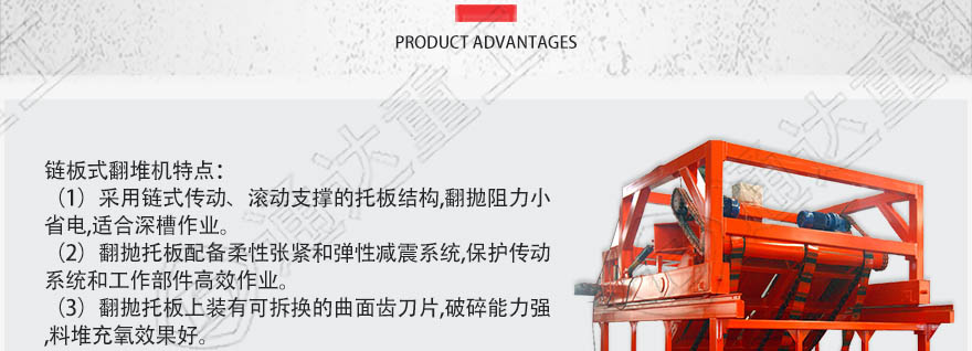 產(chǎn)品簡介: 鏈板式翻堆機(jī)適用于畜禽糞便、污泥垃圾、秸稈等有機(jī)固體廢棄物的槽式好氧堆肥。該機(jī)的行走系統(tǒng)采用變頻調(diào)速、對不同物料的適應(yīng)性較好且運(yùn)行平穩(wěn)、翻堆效率高、能進(jìn)行深槽作業(yè)等優(yōu)點(diǎn),有效縮短發(fā)酵周期,提高生產(chǎn)效率及產(chǎn)品質(zhì)量。